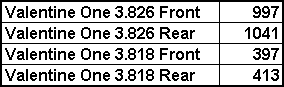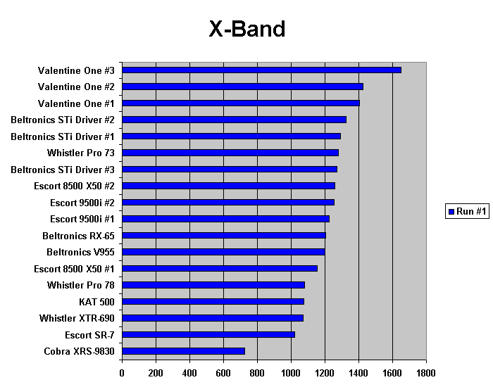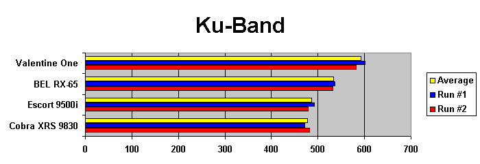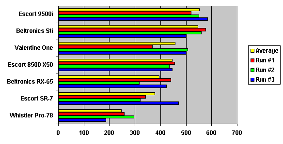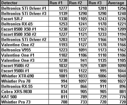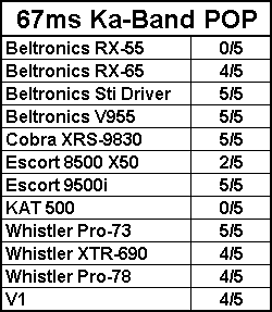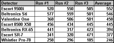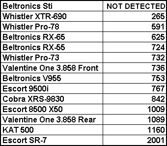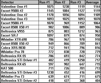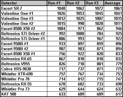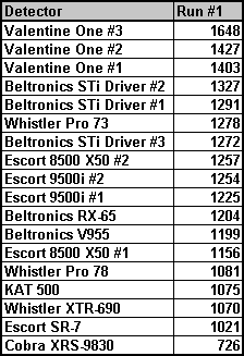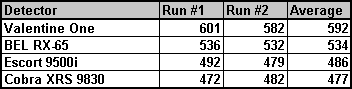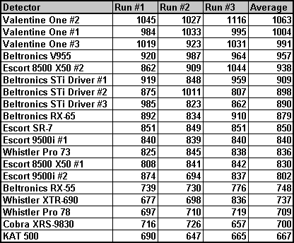 ![]() ![]() ![]() This test was set up to simulate an officer sitting on an on-ramp, clocking passing vehicles in the rear. Selected detectors got three runs against 35.5 GHz Ka. The results are the number of feet of warning before reaching the officer's location. ![]() ![]() ![]() This test was done on a straight stretch near our laser test course. This test was done on the third day, and there was NO Ka radar interference in this area like there was on the first two days. For this test, the gain control on the Spectre was set to maximum. Results are in feet. ![]() We were surprised at the V1 results, so we decided to try some older versions. Here are the results. ![]() |