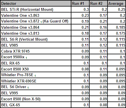![]() ![]() ![]() ![]() ![]() ![]() ![]() ![]() For the first instant-on test, the test vehicle was positioned at a distance where all of the detectors were able to detect constant-on radar. Each detector got three tries at detecting instant-on with a pulse length of 1/2 second and three tries with a pulse length of 1 second. A stopwatch was used to keep the time as consistent as possible. Of course, the time is only approximate since there is some human error involved. But remember: in the real-world, police don't use a stopwatch to time their radar bursts, and you'll be lucky if you get three chances to detect them. NOTE: In the charts below, the cells filled with black denote things which were not tested. ![]() The second instant-on test was performed the same way as the first, but this time the test vehicle was positioned at a point where only the high-end detectors were able to detect constant-on radar. This test was performed to see if additional sensitivity could compensate for the failure to alert to short radar bursts. All of the same detectors were tested to remain consistent. ![]() ![]() Our Spectre III test was performed on a straight line-of-sight course to determine the maximum distance the units were detectable by Spectre. The radar detectors were mounted one at a time in a stationary vehicle. The Spectre was mounted in a vehicle which drove slowly towards the vehicle with the detector. At the first alert from the Spectre, the vehicle stopped and the distance to the radar detector vehicle was measured using an LTI Ultralye. The Spectre III was set at maximum gain. Since the idea is to avoid detection by the Spectre, in this test a lower number indicates better performance. ![]() |